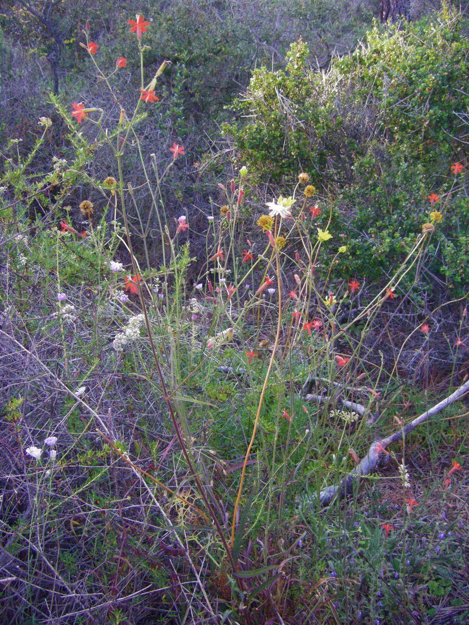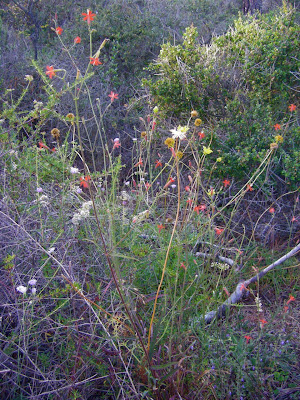 (Mexican pinks with sea dahlia and coastal buckwheat; yellow pincushion and sand verbena; lanceleaf dudleya; golden yarrow; monkeyflowers with black sage; canchalagua; more monkeyflowers and a Torrey pine)