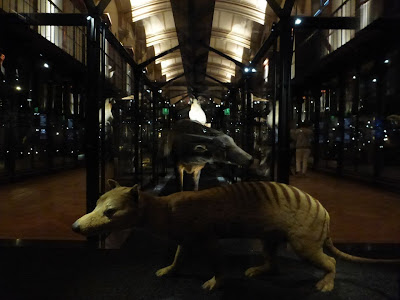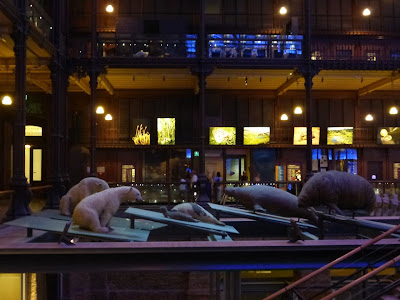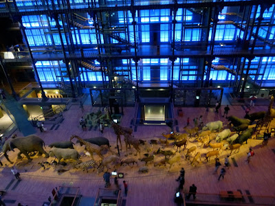 On something of a whim, went to see the great gallery of evolution at the Jardin des Plantes - a place I've wanted to see since encountering Chris Marker's remarkable 1963 sci-fi film "La Jetée." It was closed during my Paris stay for renovations, so it was the newly appointed one I saw today. Marker's post-apocalypic story plays with the museum's display of animals (18:53ff), and the sense of doom remains, though the concern now is the anthropocene rather than nuclear armageddon: the great parade of living animals, the extinct dodo and thylacine, some doomed-looking seals, quarreling monkeys, and, in tiny little boxes, human innovations; the rifle, the tractor, the Concorde, a factory...