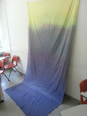 The student first dyed the whole thing yellow, then the lower portion purple (twice), to represent the struggle of ethical awareness and action - the yellow is saintly, the purple (my camera didn't capture the depth of it) human weakness and evil. It was part of the plan that eye level should be grey. Serendipitous was that the limit of the purple took on the shape of misty mountains - there's even a haze of green. Profound was the way it represented both the difficulty of ethics (it appears mostly purple, the yellow unattainable) and the underlying goodness of human nature (it's all yellow)... To know that you need to know how it was made. That's fitting, too, for process-intentional seminar pedagogy.