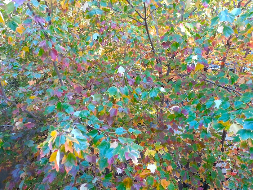 Two scenes from New School windows. Above is one of the pieces of stained glass from a small concert hall in the most recent home of the Mannes School of Music, now overlooking 13th Street. Below is my office view of the Lang courtyard trees. In some years the leaves were flaming red by now, but this year they may go a different direction, most currently green with yellow edges - but a few have turned a deep red.