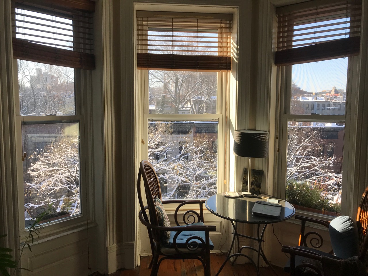 "Buddhist Modernism" wrapped up today - here's the classroom after the students had left. The room gave us nothing but trouble, being by turns too hot and too cold (sometimes both), noisy, and both dim and too bright to see much when using the overhead projector. The chairs were uncomfortable, and stuck to the vinyl floor when you tried to move them into a circle; their little desklets periodically flipped a student's things onto the ground. I commended the class for its success in forming a learning community (a sangha, one said!) despite the room. And I promised we'd find a way to get together in half a year in this very space, where we'd find ourselves nostalgic precisely about its discomforts.Easy to say on a day of beautiful winter light... Notice all those prime colors peeking in the windows!