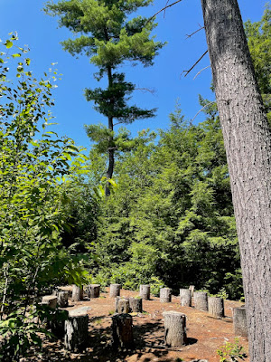 The 106 acres are open at all times for visitors but a weekly service starts Sundays at 9:30, proceeding from a small parking clearing up to a place referred to as “the knoll,” a small clearing with an oval of tree stump stools around a cluster of three stumps, on which a ceramic chalice (decorated with a mountain pattern), a wooden plate and flowers from someone's garden await. (When it’s too cold or wet, the community meet in a barn.) As we began, the area of this altar shimmered in dappled light whenever a breeze tickled a small birch to one side. At either end of the oval, youngish white pines towered, surprisingly tall for a woods which, when Blackmer acquired it a decade and a half ago, had been messily logged of most larger trees.