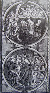 But don't suppose you can understand any of these images on its own. In a "Bible Moralisée" like this, each Old Testament scene is paired with a New Testament scene which it prefigures. (Just don't ask me which scene goes with which, though I'd sorely like to know - if you can figure it out, I'd be happy to learn!) This is from a version dating perhaps to the early 1220s, and resides in the Österreichische Nationalbibliothek in Vienna. Sometimes "Bible Moralisée" pairings are horizontal, but usually, as here, they are vertical. From the same page: