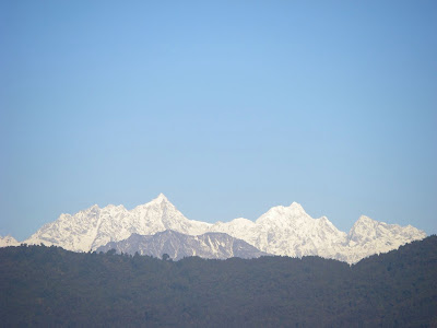 Have I mentioned that Kangchenjunga overlooks Gangtok, too? Darjeeling gets to see more of it, but Gangtok is closer, and the angle makes its peaks peakier. It shines long before sunlight hits Gangtok - above and below the view from Development Area, where I'm staying.